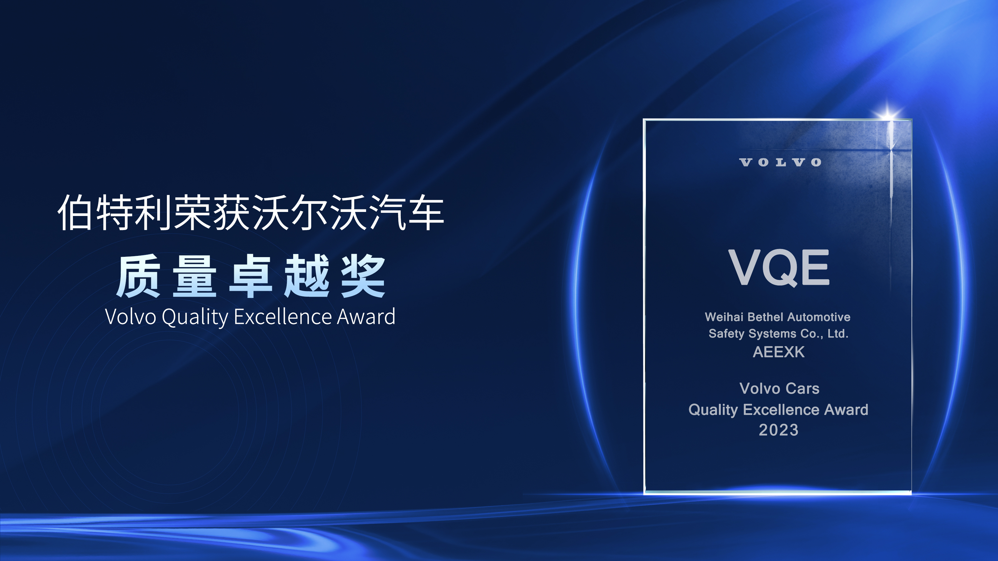 2024年1月19日,沃爾沃汽車供應(yīng)商大會(huì)在三亞召開,伯特利被沃爾沃授予“質(zhì)量卓越獎(jiǎng)”(Volvo Quality Excellence Award)。該獎(jiǎng)項(xiàng)是沃爾沃汽車體系內(nèi)質(zhì)量管理的最高榮譽(yù),也是沃爾沃汽車全球供應(yīng)商共同追求的最高目標(biāo)。