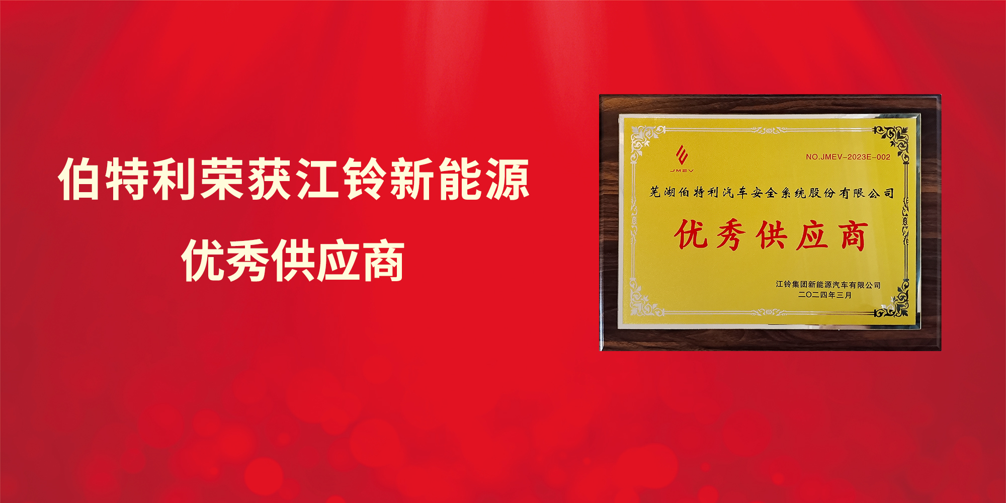 2024年3月4日,江鈴新能源供應(yīng)商合作伙伴大會在南昌召開,伯特利憑借在制動領(lǐng)域強大的科研實力和穩(wěn)定的供貨表現(xiàn),榮獲江鈴新能源2023年度“優(yōu)秀供應(yīng)商”。