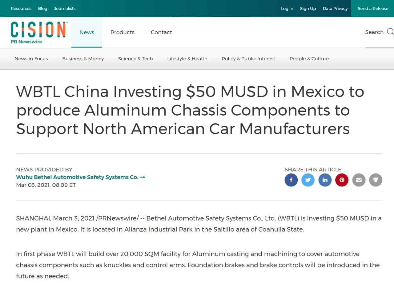 全球化持續推進 伯特利墨西哥工廠開工建設